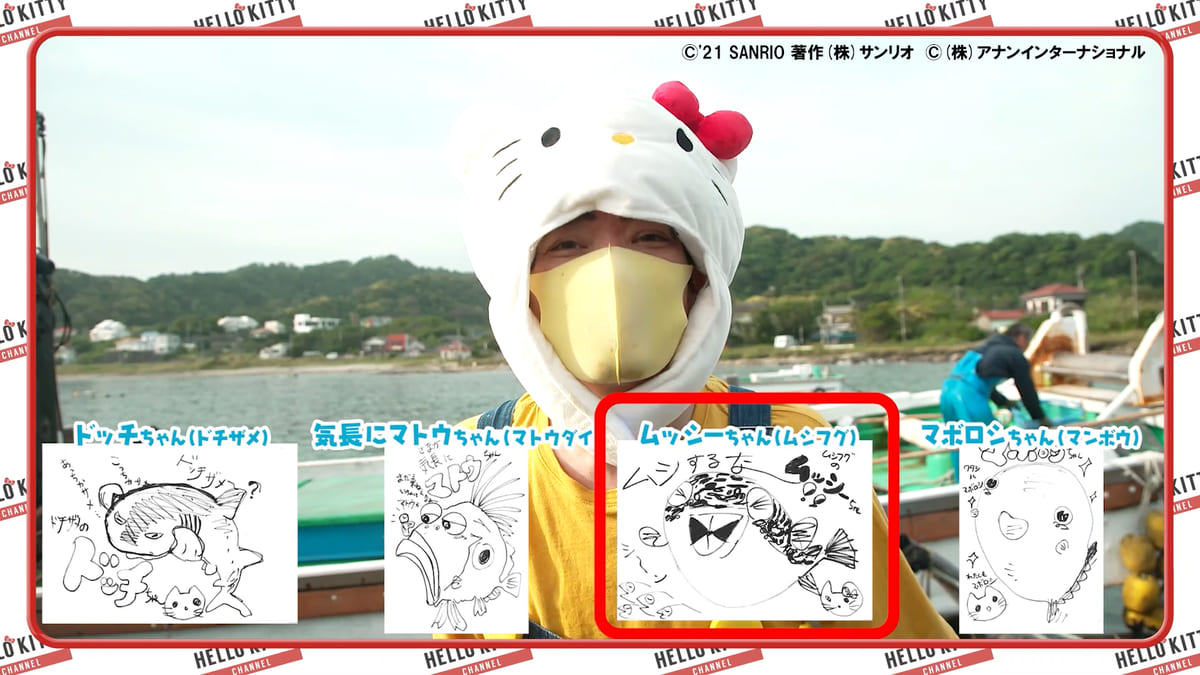 さかなクンもハコフグ帽から、キティ帽子・キティとお揃いのオーバーオール姿に変身して登場し、さかなクンの地元・館山の海で定置網漁を体験しながら、新しいお魚のキャラクターを考えます☆