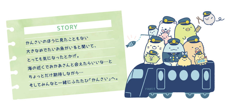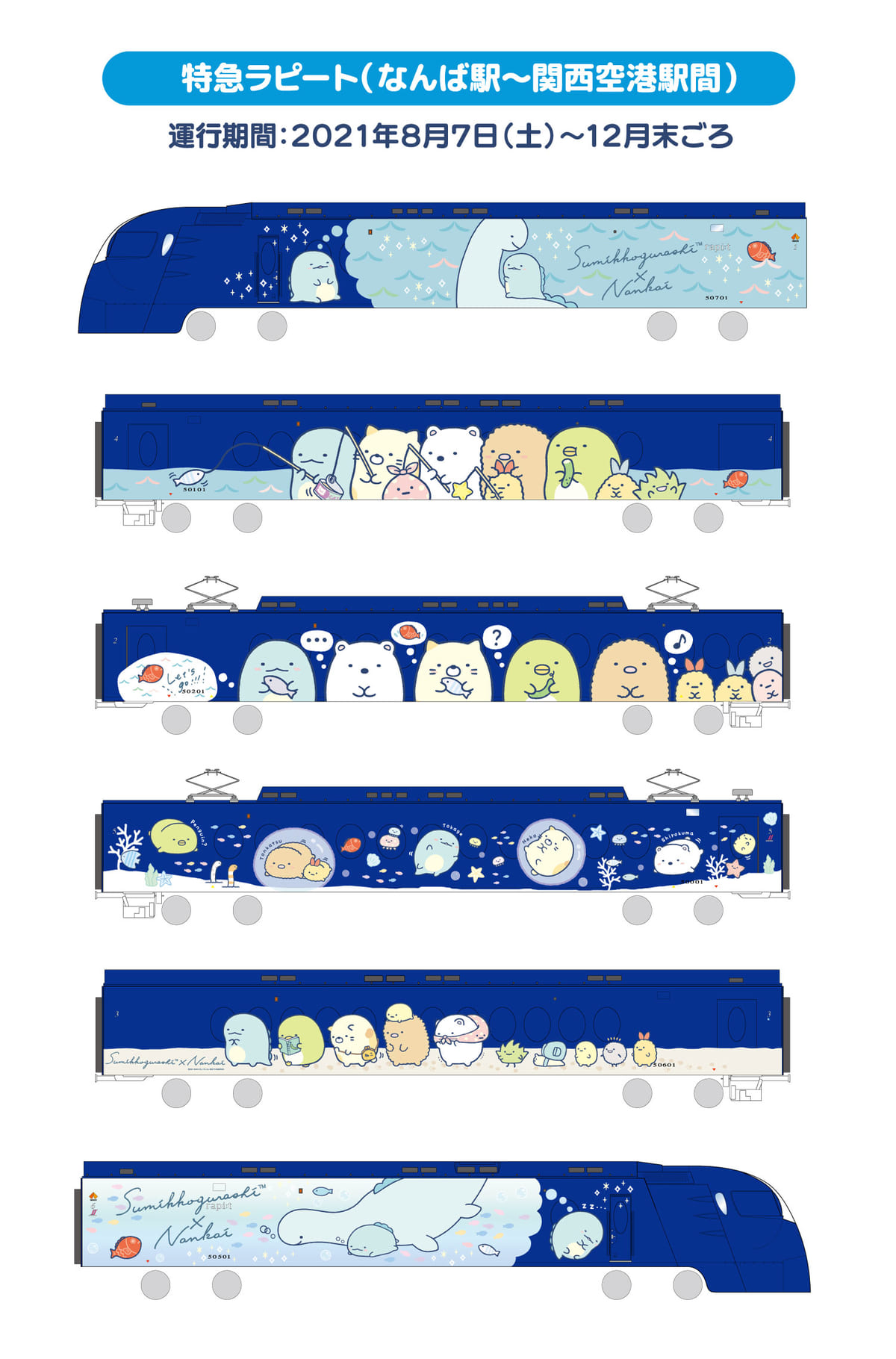 特急ラピートは、大きなめでたいお魚をさがしに海へいくすみっコたちのストーリーを表現した列車になっています。
