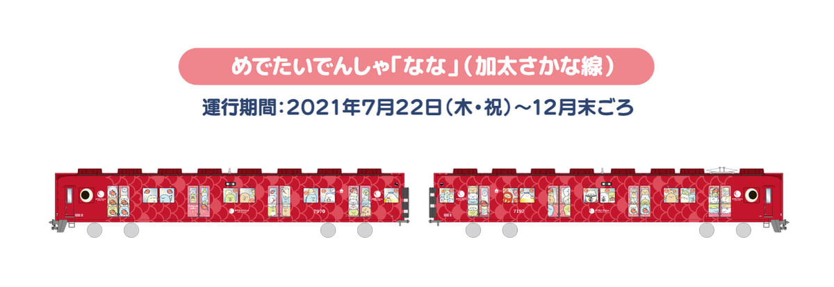 真っ赤なタイが電車になった「めでたいでんしゃ なな」も、『すみっコぐらし』デザインに変身です!