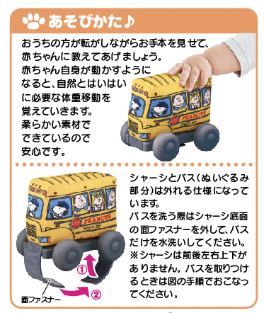 今回紹介するのは「スヌーピー」と仲間たちがバスに乗っているシーンがデザインされた、手転がしができるおもちゃ。