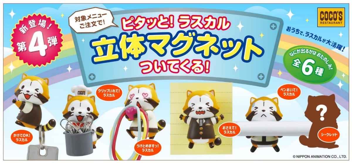 ファミリーレストラン「ココス」にて、「ピタッと!ラスカル立体マグネット」の第4弾が順次登場します!