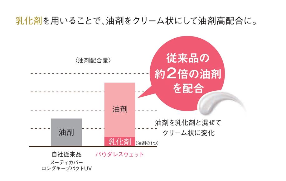 従来のカネボウ製品の約2倍の油剤を配合した「コフレドール パウダレスウェット」は、肌なじみの良いなめらかな仕上がりが特長です。