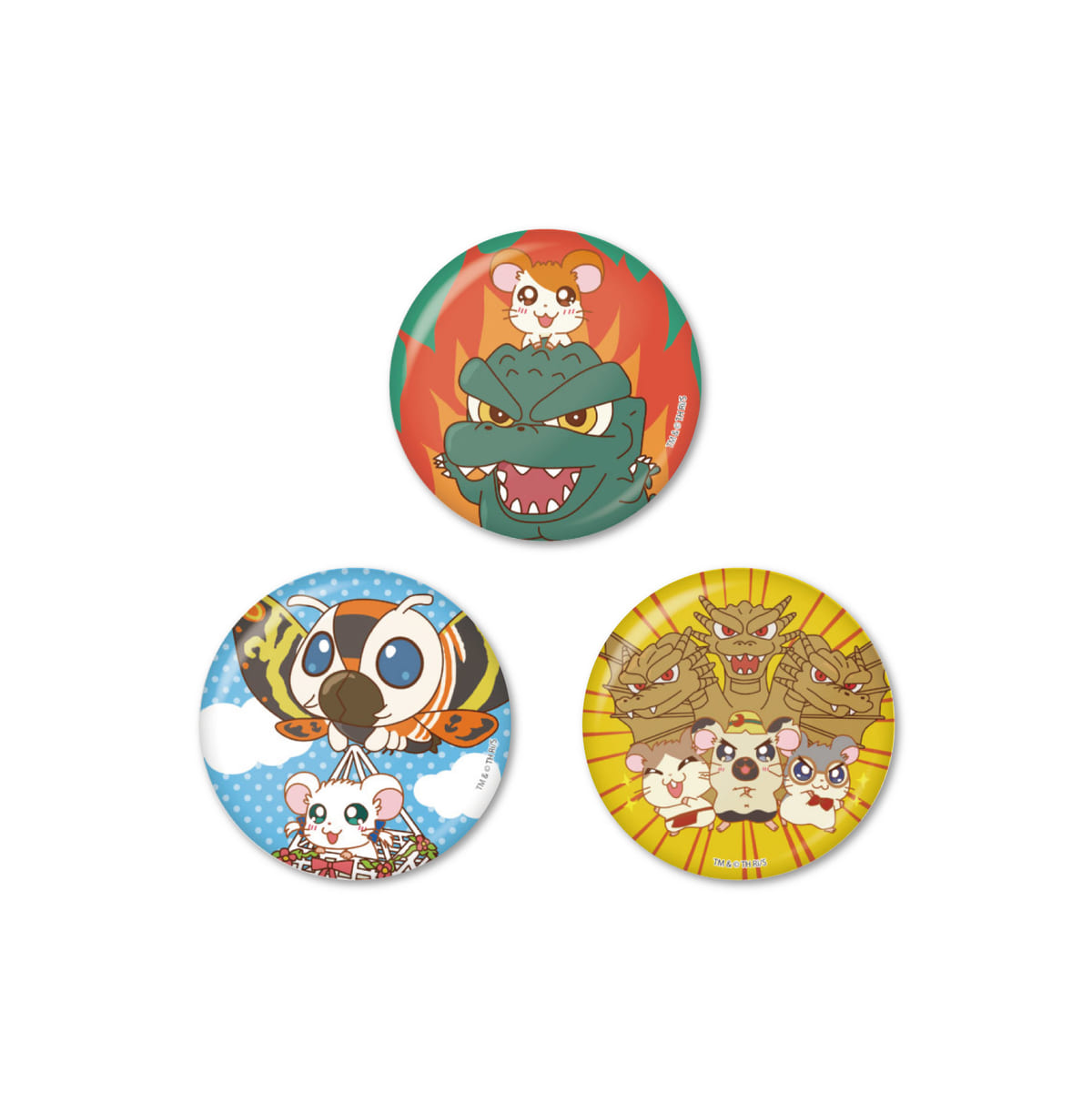 「ゴジラ」と「ハム太郎」だけでなく、人気の怪獣や「ハム太郎」の友だちデザインもラインナップした、メタリック缶バッジ。