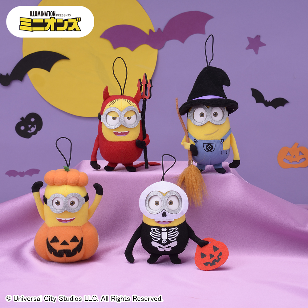 ハロウィンをイメージした、悪魔や魔女、がいこつの仮装を楽しむミニオンたち。