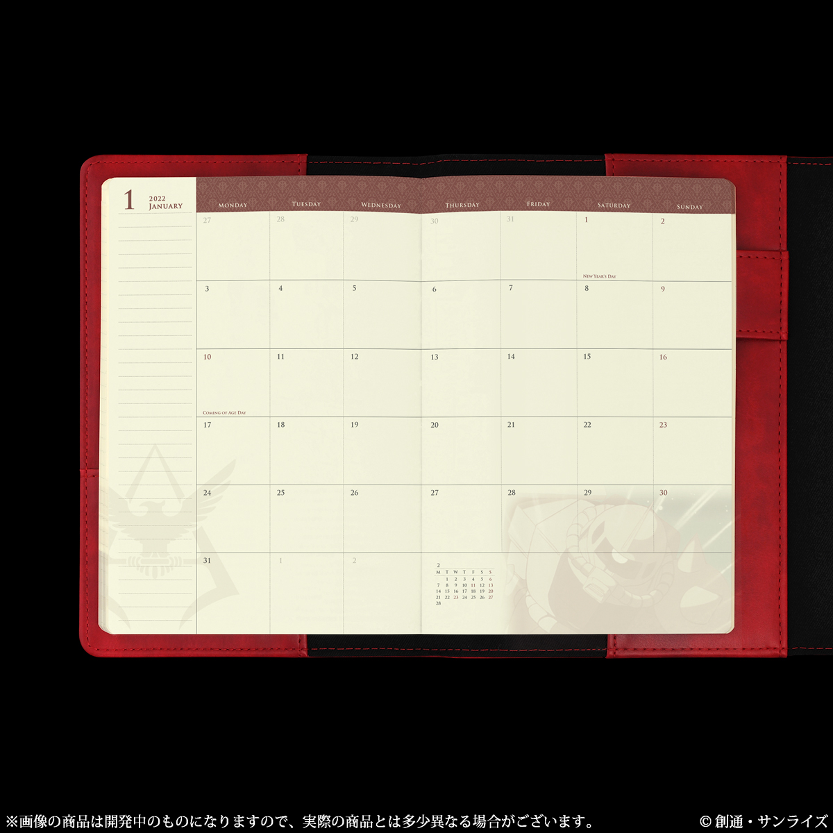 月間ページ(2022年1月~12月)は1ヶ月の予定が書き込みやすい大きなコマスペースが採用され、パーソナルエンブレムや「シャア専用ザク」のアートが透かし印刷されています。