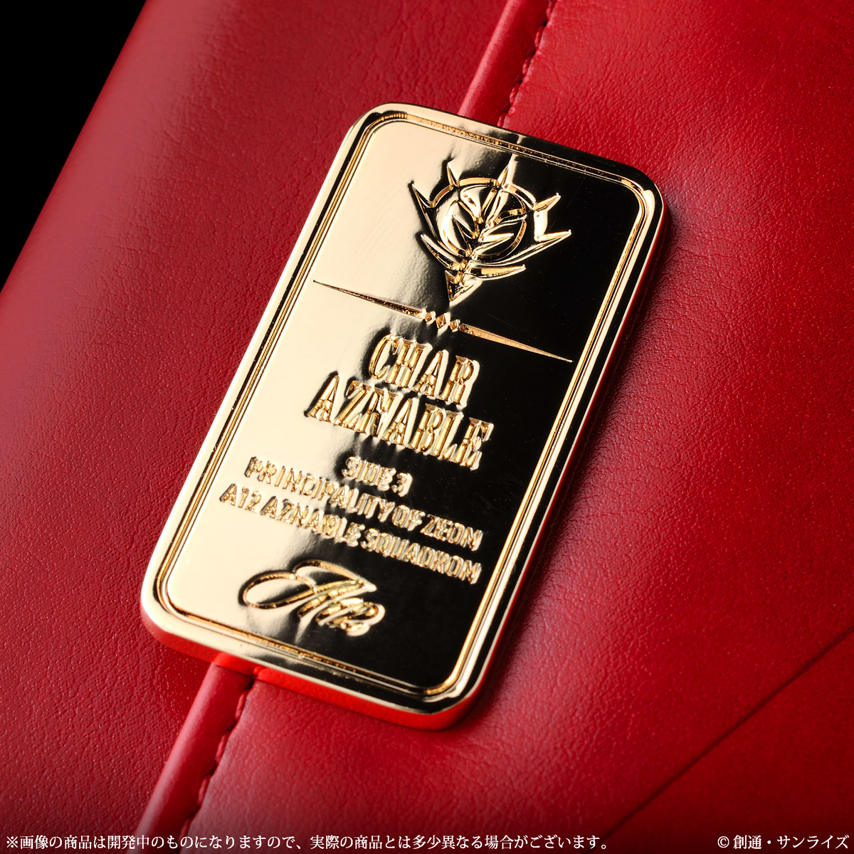 金色に輝く豪華なドッグタグ風デザインの金具には、ジオン公国のエンブレムと「シャア専用」を強く印象付けその名が刻印されています。