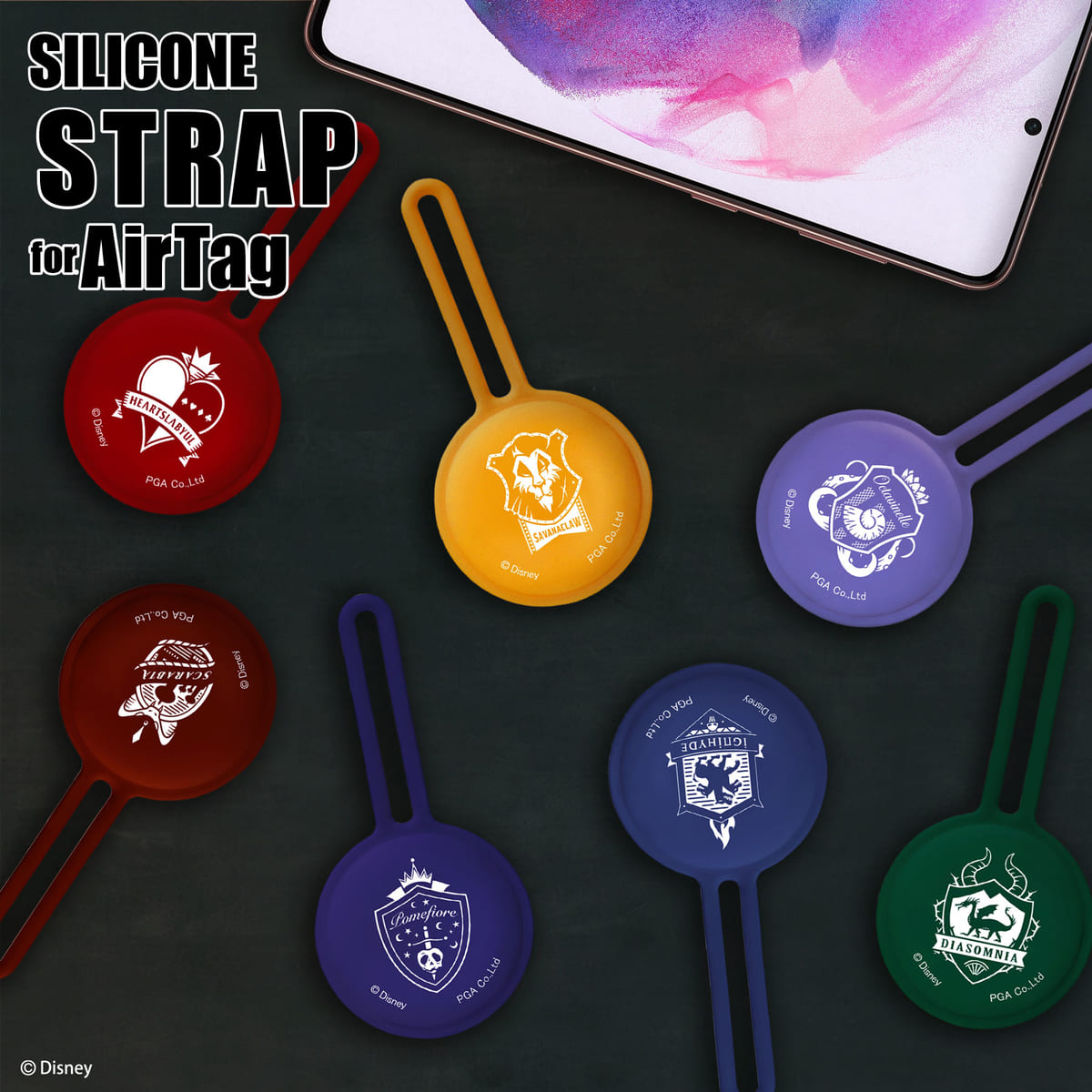 そんな『ディズニー ツイステッドワンダーランド』の各寮章がデザインされた、柔らかなシリコン素材を使用したAirTag用の抗菌シリコンストラップが登場です。