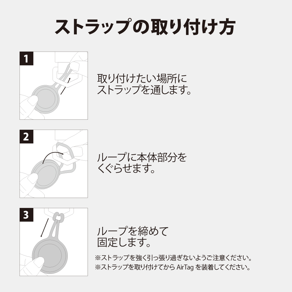バッグの金具やキーチェーンにストラップを通して結びつけるループタイプで取り付けが簡単。
