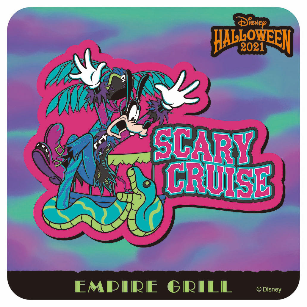 「スケアリー クルーズ」と記されたコースターには、両手を大きく広げた「グーフィー」の姿が!