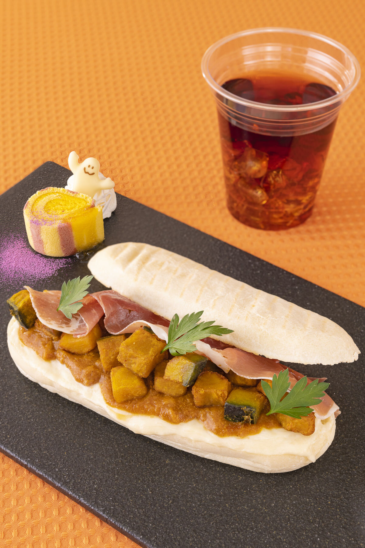 ロールケーキはおばけ型のチョコレートや紫芋のパウダーなどハロウィーンらしいモチーフが添えられていて、オレンジソースの酸味がアクセントになっています。