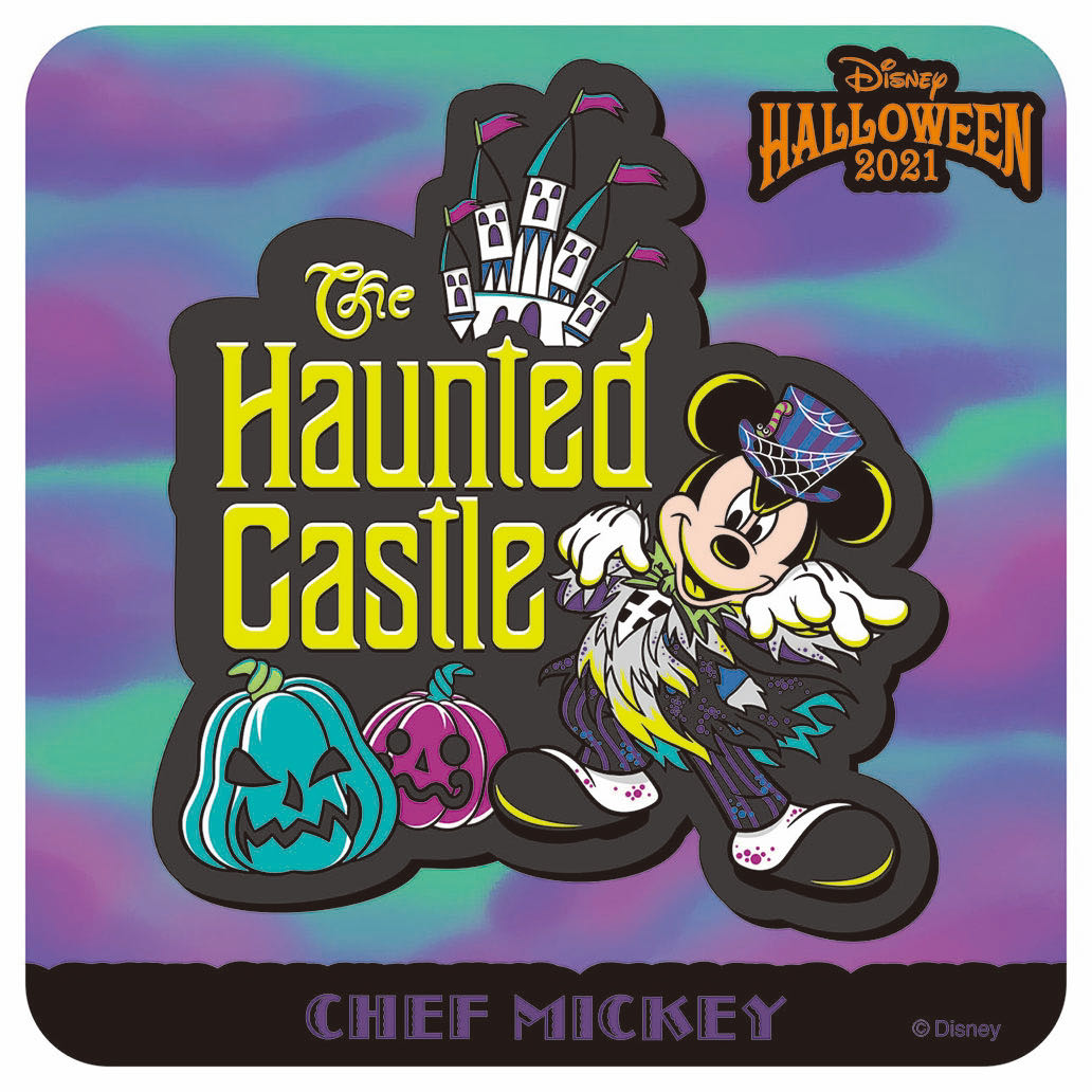 大きく描かれた「ホーンテッド・キャッスル」の文字と、「ミッキーマウス」、そしてお化けカボチャがポイント。