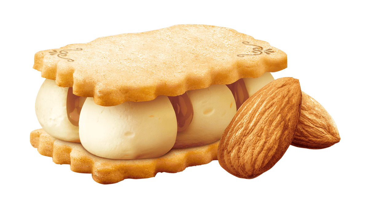 香ばしいアーモンドソースを加えた濃厚な味わいのバターアイスクリームを、香り豊かなアーモンドチョコレートコーティングで包み込み、サクサクのウエハースでサンドしたアイスクリームです。