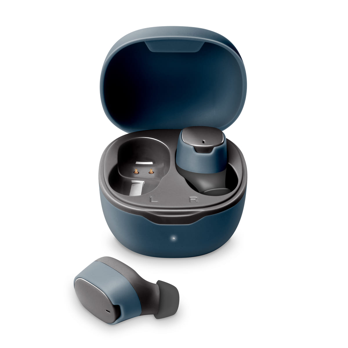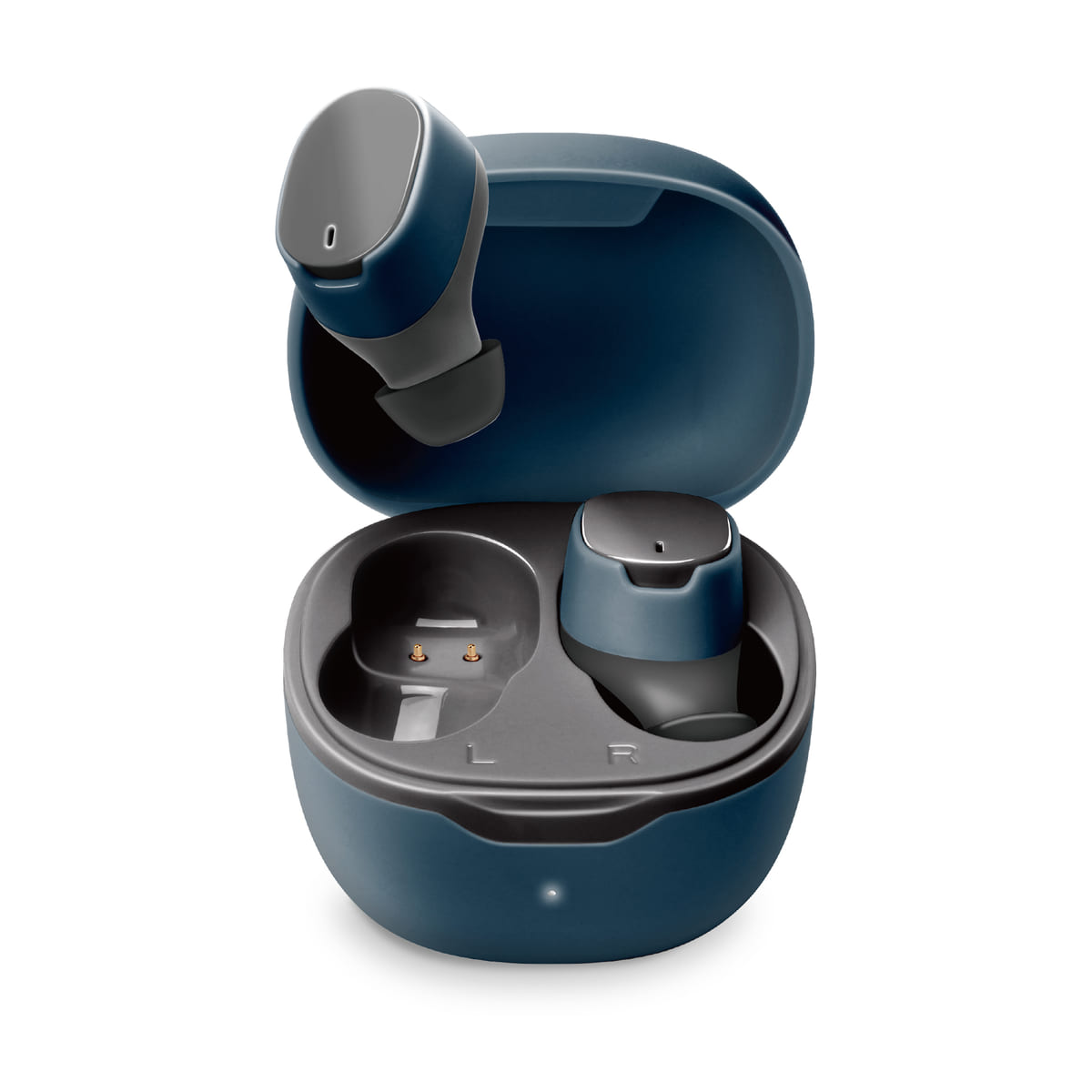 ポケットサイズのコンパクトな充電ケースは、イヤホンを約3回フル充電可能。