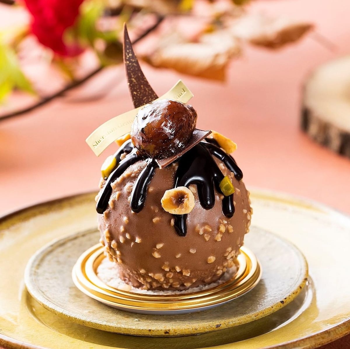 ヘーゼルナッツのダックワーズに、ヘーゼルムースとヘーゼルナッツのクラックランを層にして閉じ込めた球形のマロンムースがのせられています。