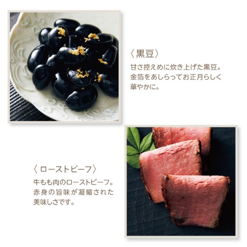 おせちには海老や数の子、お煮しめ、ローストビーフや黒豆といった定番食材のほか、お子さんが喜ぶメニューもたっぷり。