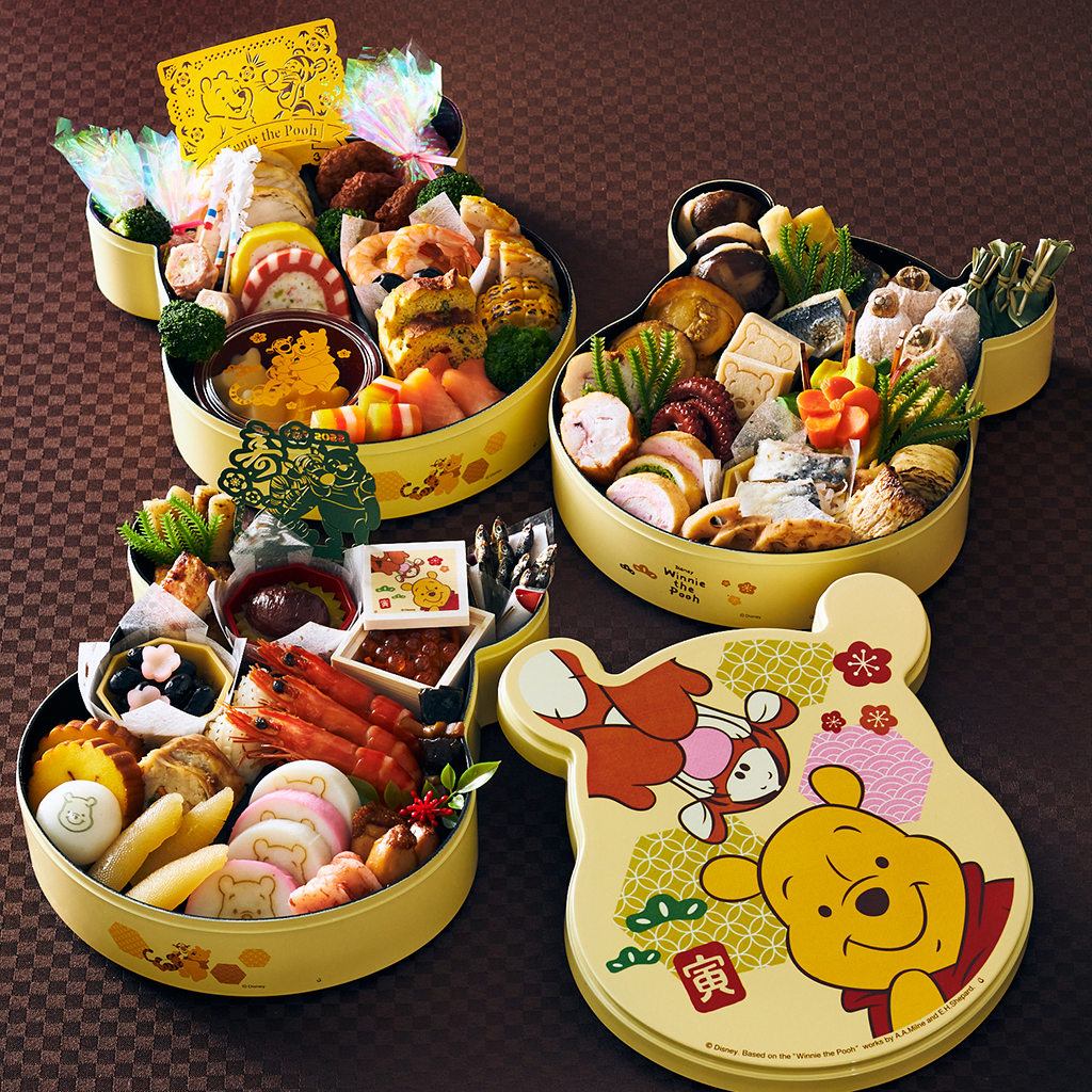 また、着物姿の「ミッキー&ミニー」が素敵なオリジナルデザインの重箱が魅力の『おせち・三段重「プレミアム」』、桜モチーフとキャラクターを組み合わせた晴れやかなデザインのミッキーフェイス型重箱『おせち・三段重「ミッキー&ミニー」』や、「くまのプーさん」と「ティガー」を組み合わせた寅年ならではのフェイス型重箱『おせち・三段重「くまのプーさん」』も登場します。