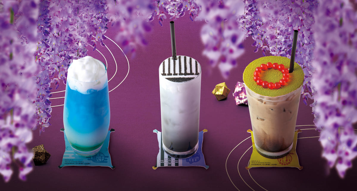 ユニバーサル・スタジオ・ジャパン「鬼滅の刃」テーマレストラン『藤の花の食事処』(左)空色ソーダ_(中)黒すぐりヨーグルト_(右)ほうじ茶ミルク