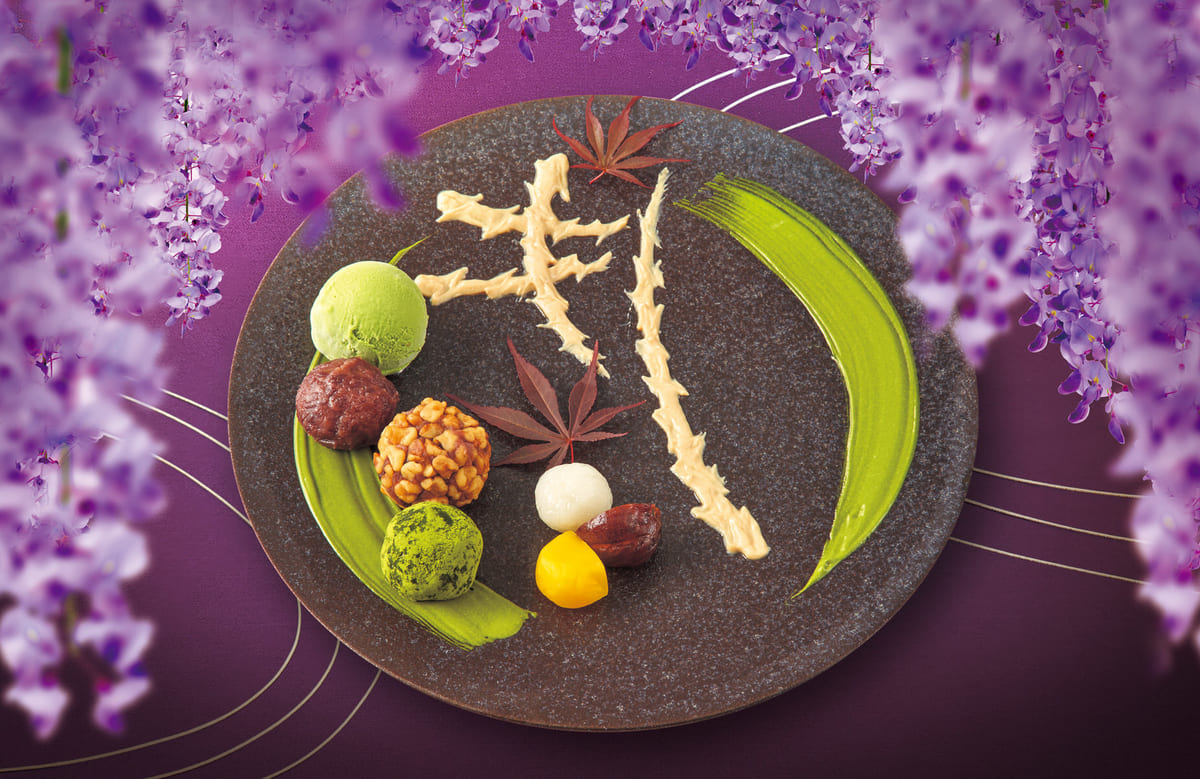みつ豆に桜餅風の求肥、ハートのマカロンなど、可憐でやわらかなイメージが表現されています。