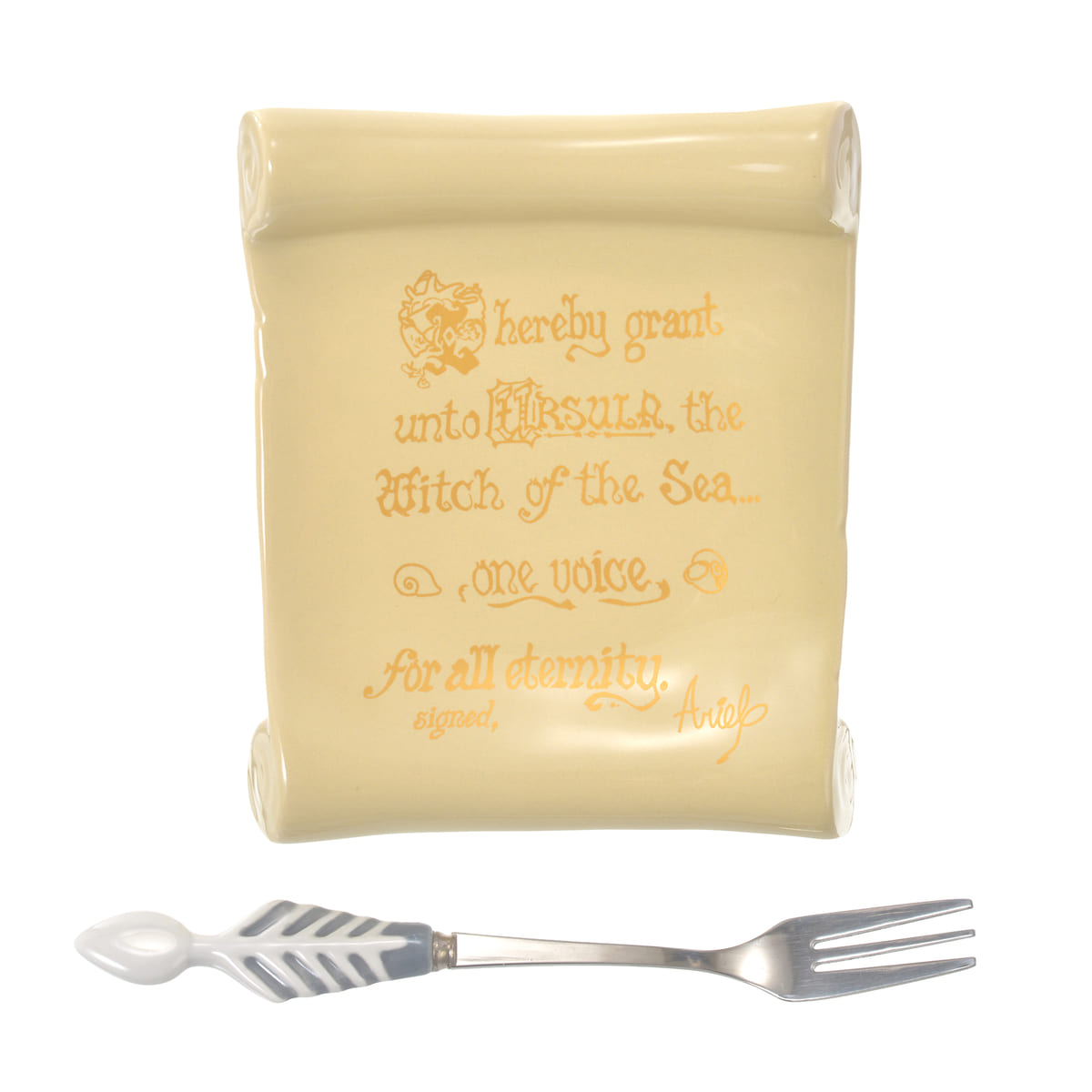 「アースラ」とディズニープリンセス「アリエル」が取り交わす契約書を模したミニプレートとフォークのセット。