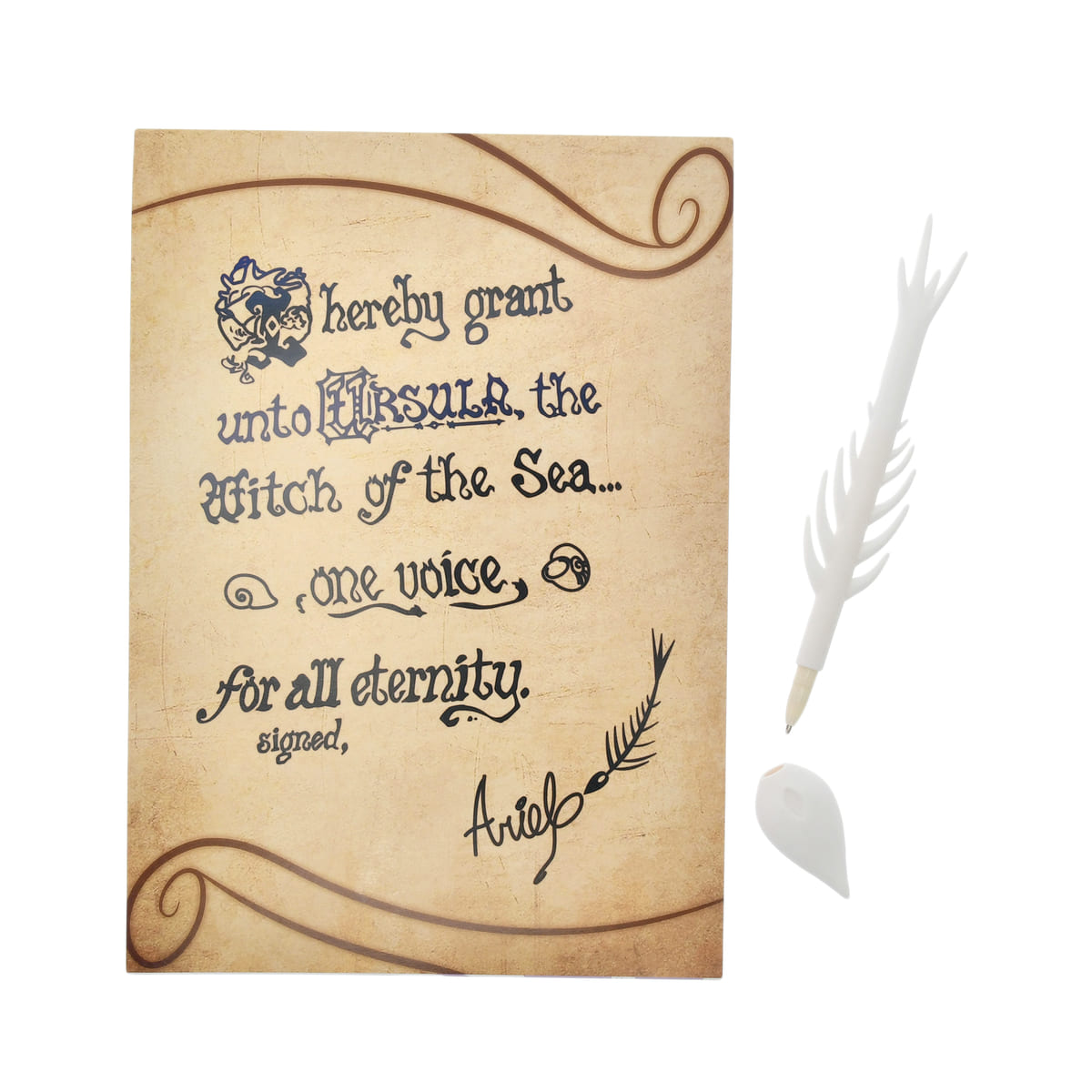 「アースラ」と「アリエル」が取り交わす契約書が再現されたメモパッドとボールペンセット。