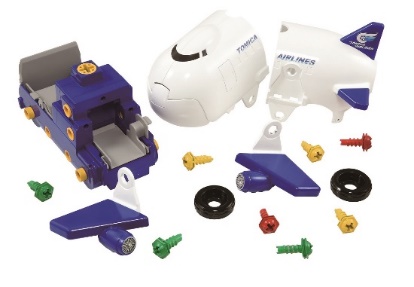 セット内容:電動ドライバー本体×1、ビット×1、持ち手×1、ねじ(赤・緑・黄)×各4、ラベル×1、シャーシ×1、タイヤ×4、キャリアカー(キャブ・荷台うしろ・荷台まえ)×各1、カーゴジェット(ボディまえ・ボディうしろ)×各1、尾翼(垂直・左・右)×各1、つばさ(左・右)×各1、つばさとりつけパーツ×2