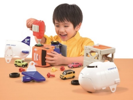 電動ドライバーを使って、乗り物の「組み立て」「組み替え」「分解」の他、トミカの人気の要素である「トミカ(ミニカー)と連動したアクション」もできるなど、組み立て&トミカ(ミニカー)遊びの両方が可能。