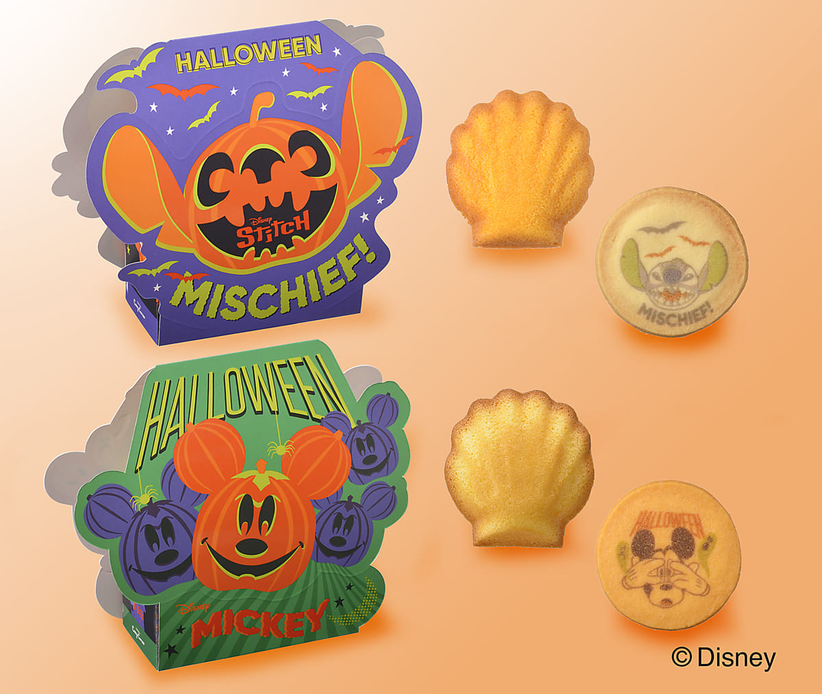 「ミッキーマウス」と「スティッチ」がデザインされた、ハロウィン限定の焼菓子アソートがラインナップ。