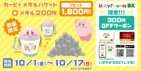 期間中、モーリーフレンズDXアプリ会員またはカード会員の方には、「Hello☆Kirby メダルバケット」セットが300円OFFになる会員限定クーポンがプレゼントされます。
