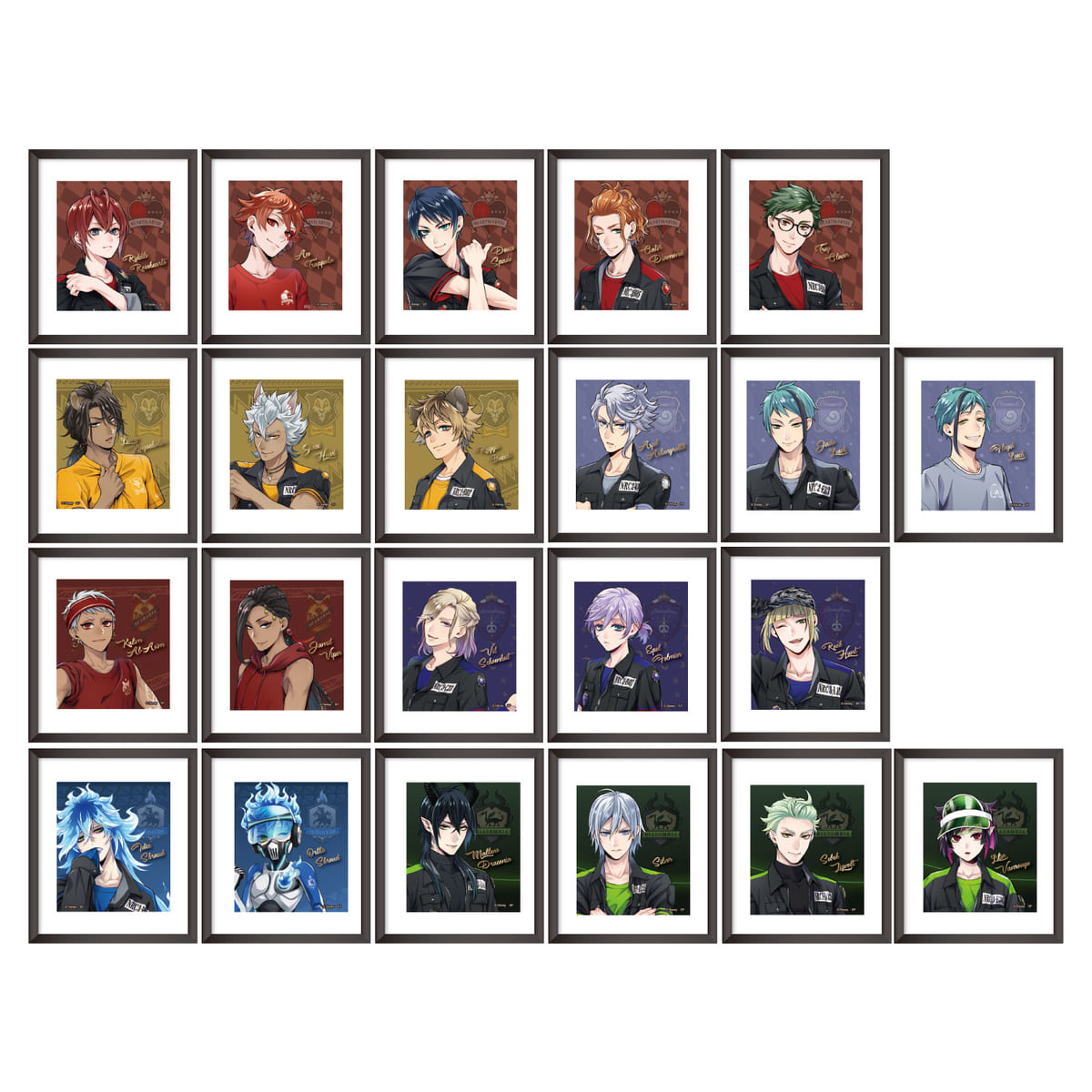 寮生の個性があふれ出るポージングが楽しい美麗イラストに、所属する寮をイメージした背景とネーム入りリボンフレームを合わせた、エレガントなアートを黒い額縁で飾っています。