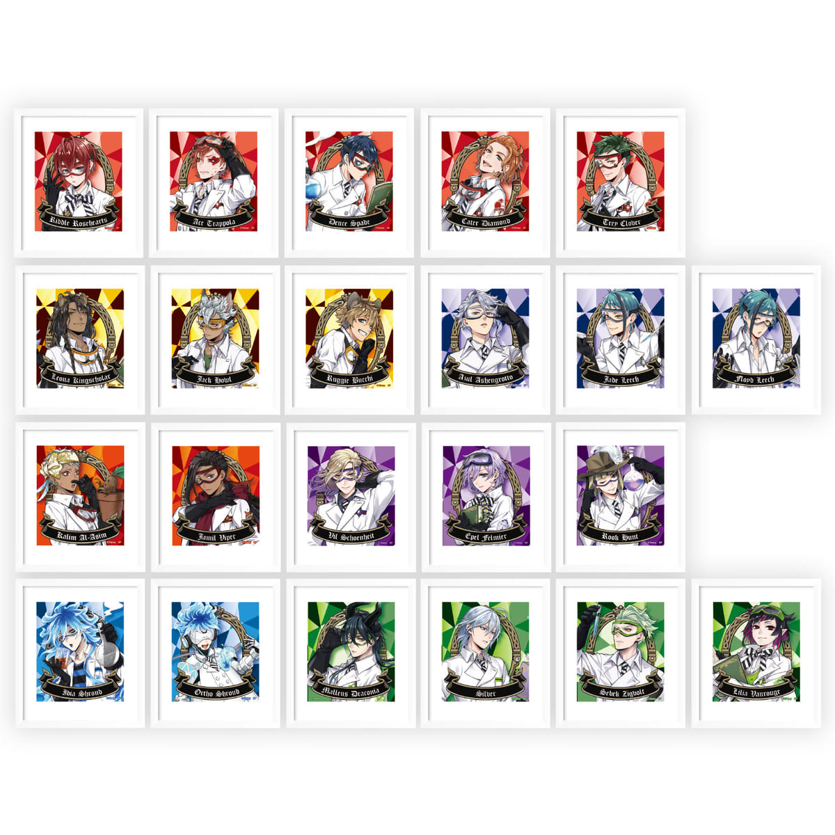 鏡のフレームと各寮カラーのジュエル風背景を背負ったキャラクター美麗アートを白い額縁で飾った全22種がラインナップされています。