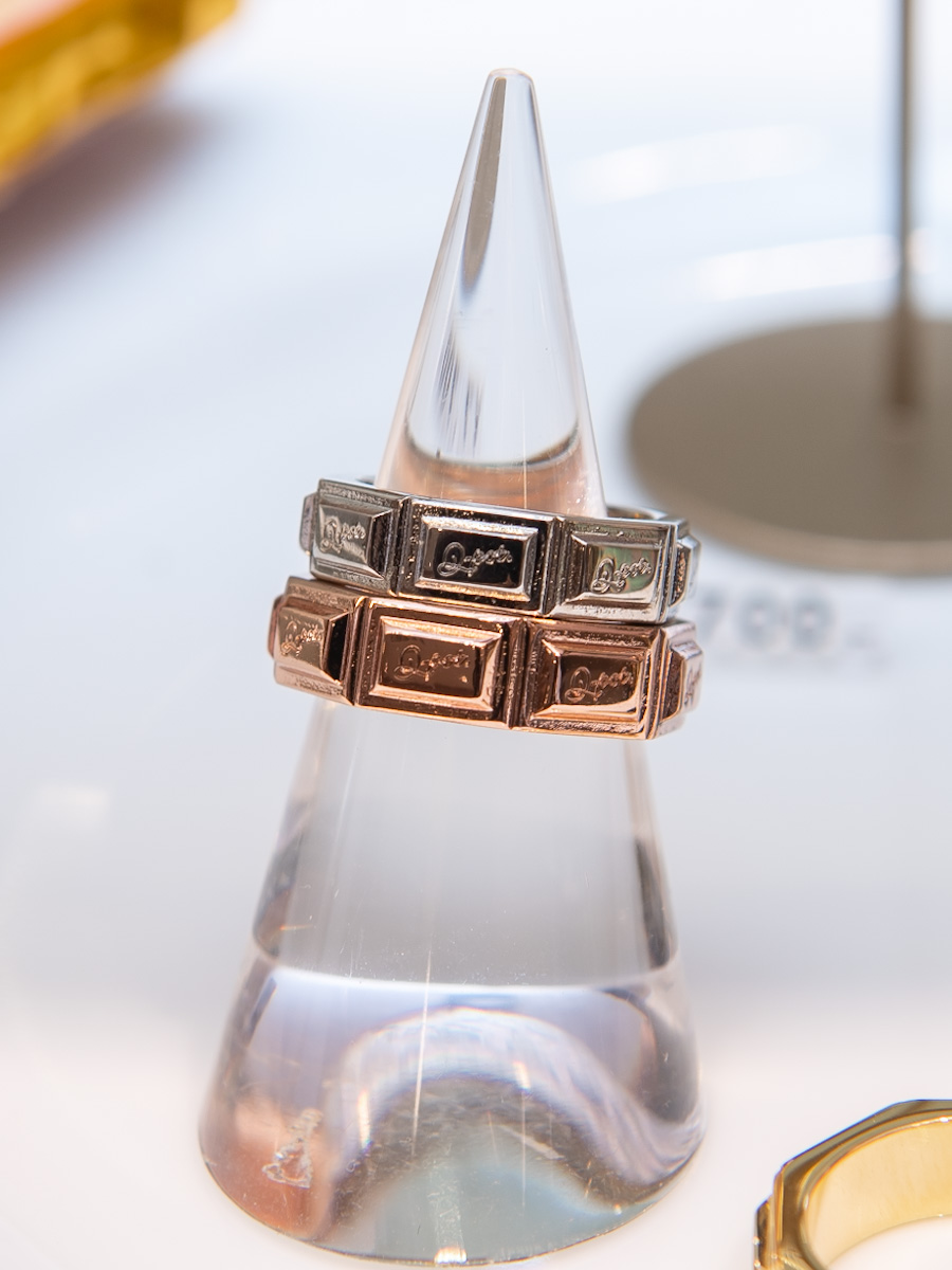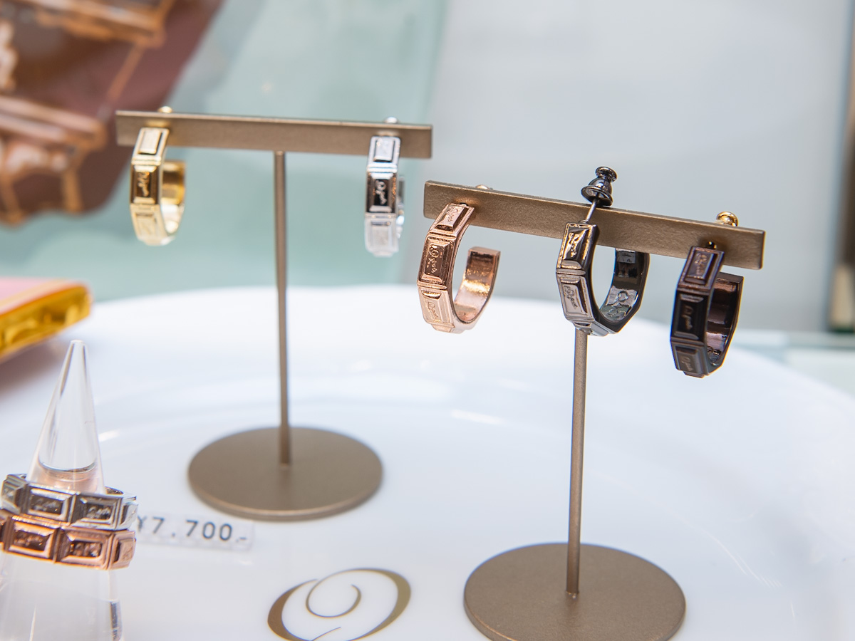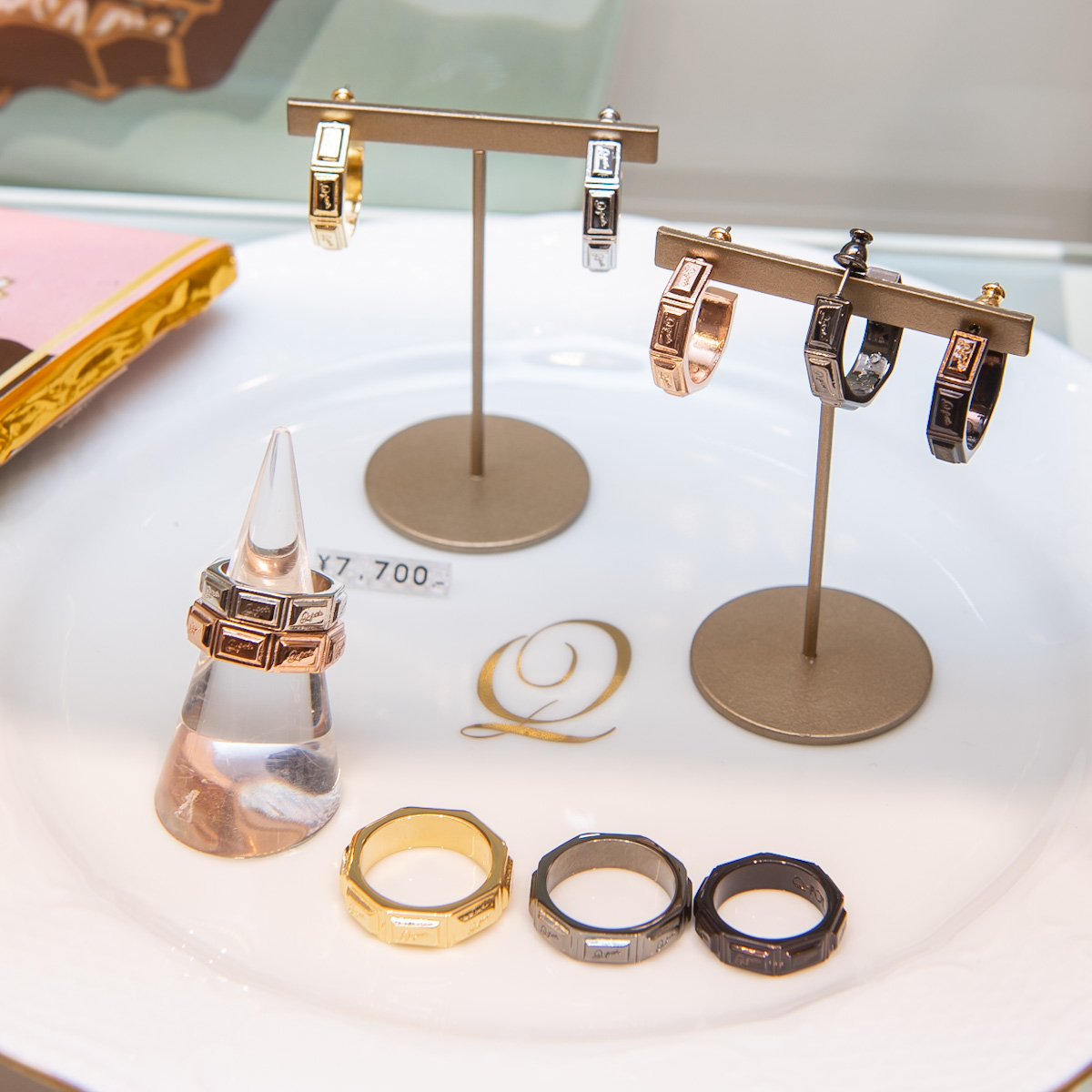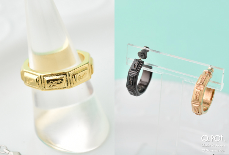 「Q-pot.」のロゴが刻まれた、タブレットチョコレート型のリングとフープピアス。