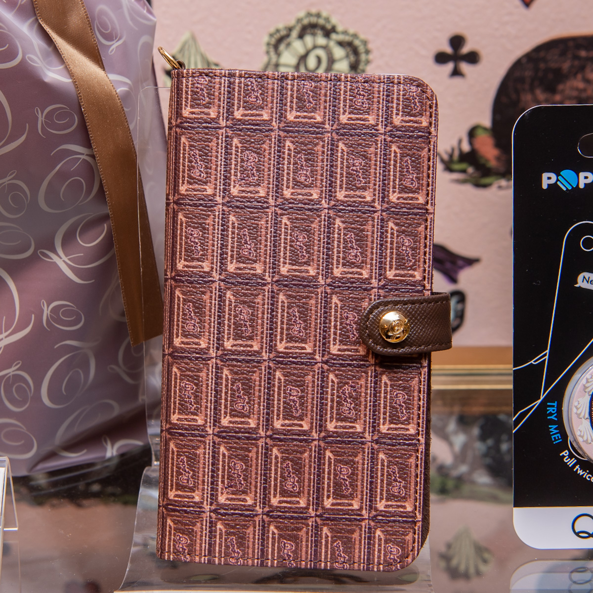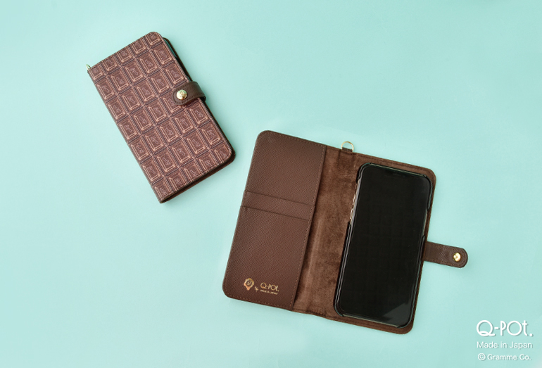 ビターチョコレートでデコレーションされた手帳型のiPhoneケース。
