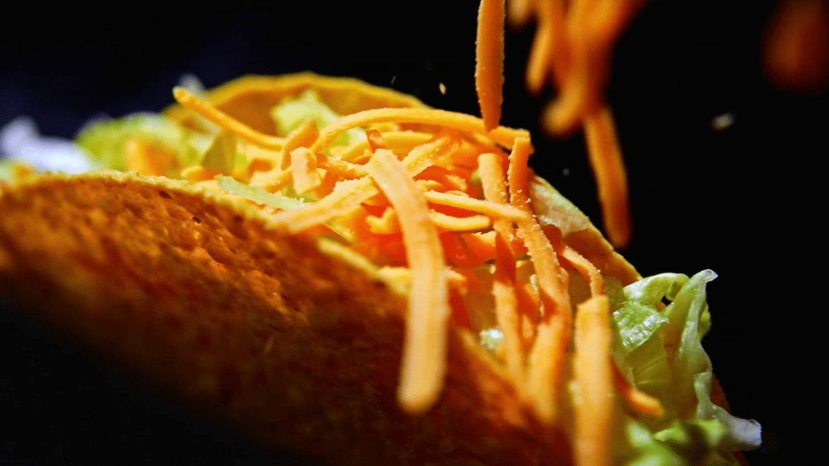 レッドチェダーチーズやサワークリームが重なり合い、躍動感あふれるカットを見ていると、タコスが食べたくなりそうです!