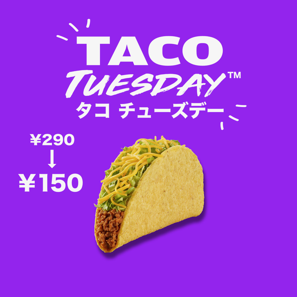 毎週火曜日、タコベル公式LINEアカウントの「タコチューズデー」画面を提示するだけで、特別価格150円で購入できます。