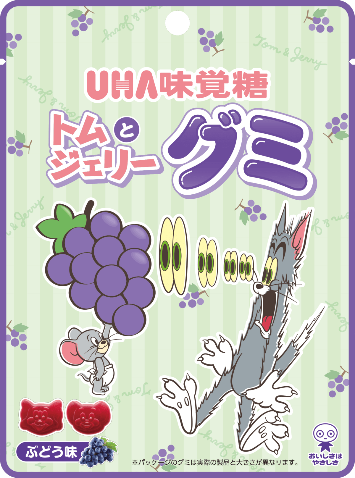 「トムとジェリーグミ」は、ぶどう味の「トム」と「ジェリー」の可愛らしい顔型グミ。