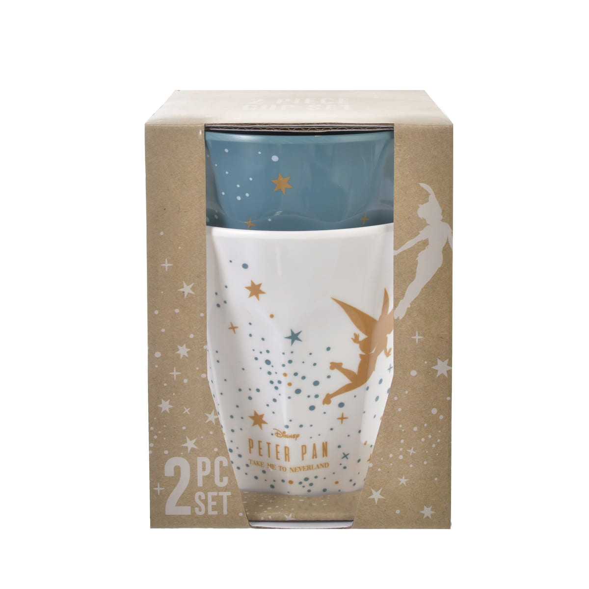 空を飛ぶ「ピーター・パン」と「ティンカー・ベル」がそれぞれプリントされた、色違いのコップ。