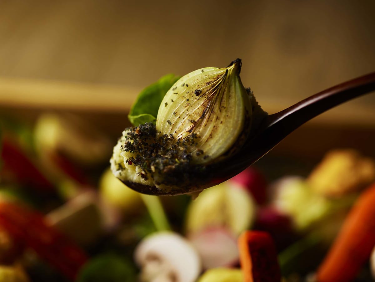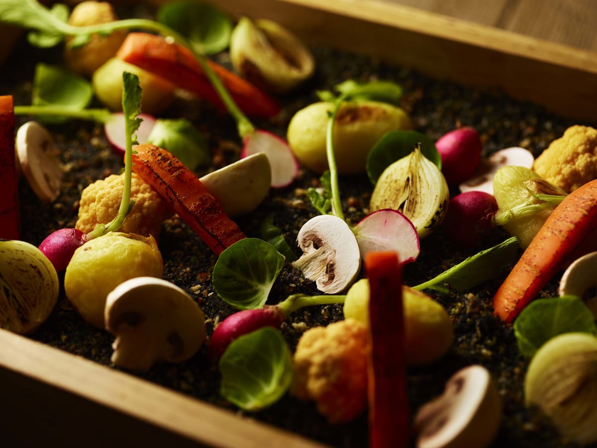 土に見立てたマッシュポテトから野菜をすくって食べるこのメニューは、まるで自分で収穫をしているような感覚が体験できます。
