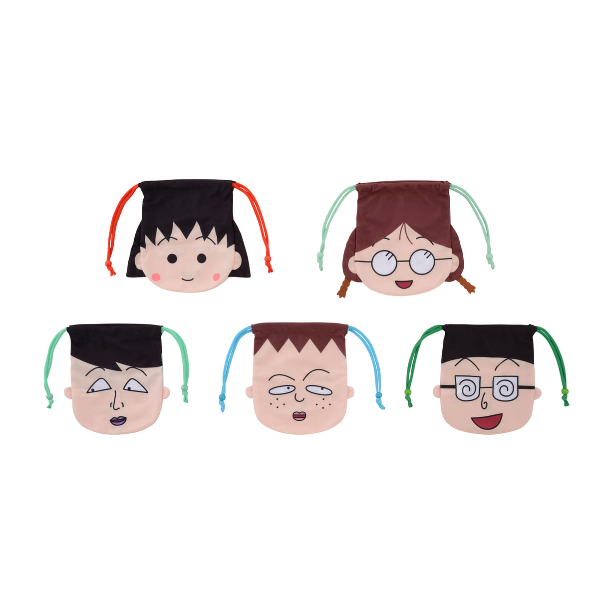 「まる子」と3年4組のクラスメイト「たまちゃん」「藤木君」「永沢君」「丸尾君」のお顔がデザインされた巾着。