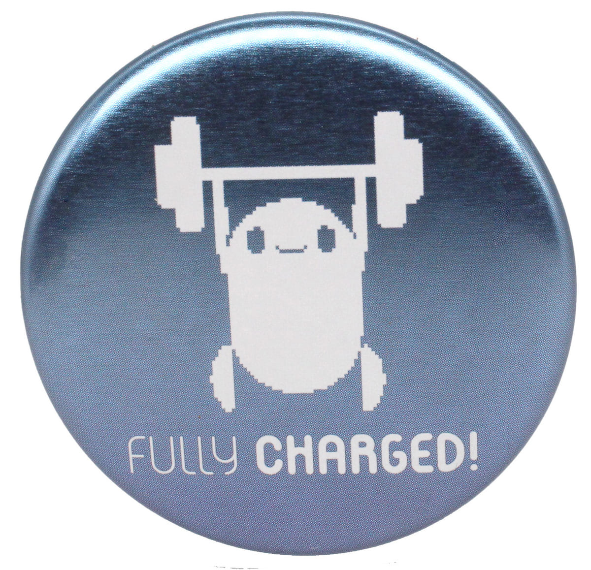 充電が完了して、元気いっぱいの「ロン」がドット絵風に描かれた缶バッジ。