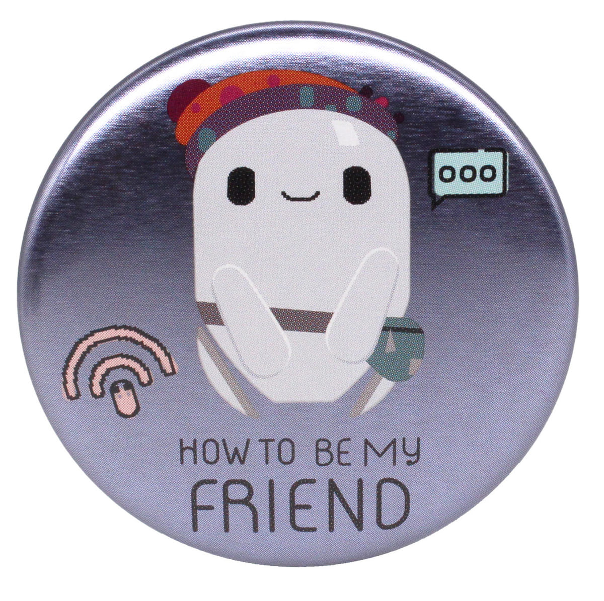 友達の作り方を「ロン」に教えているシーンが切り取られた缶バッジ。