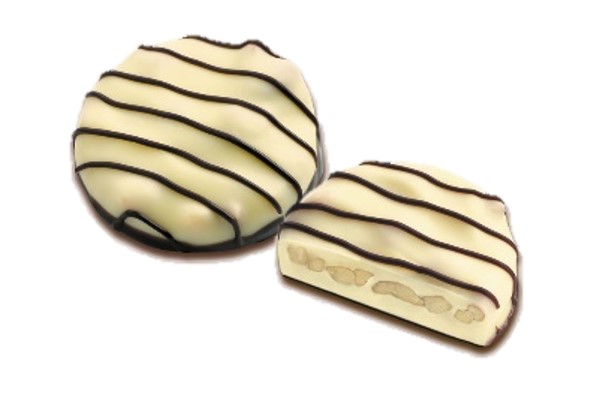 マカダミアナッツをクリーミーなホワイトチョコレートで包み、ダークチョコレートにディップし、ダークチョコレートのラインでデコレーション。