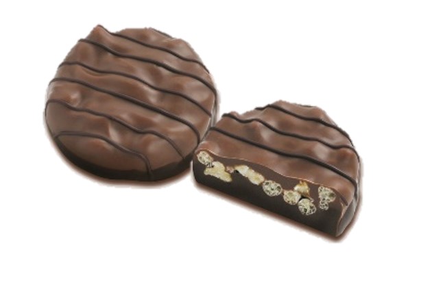 香ばしいぺカンナッツとライスパフの食感がアクセントのミルクチョコレートをダークチョコレートにディップし、ダークチョコレートのラインでデコレーション。