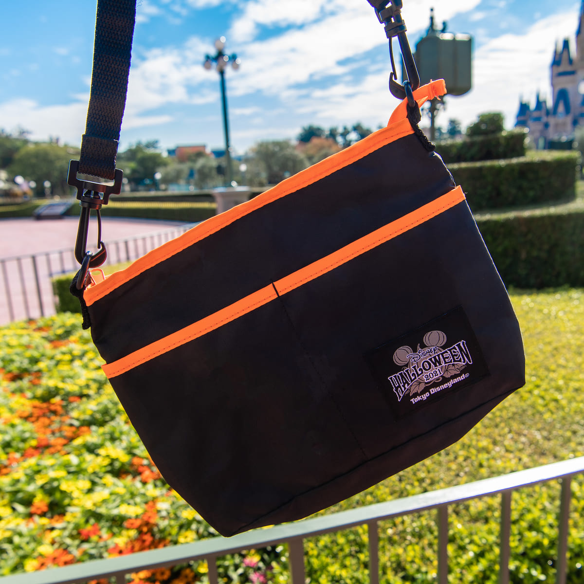 “ディズニー・ハロウィーン2021”のロゴ入りで、黒とオレンジのハロウィーンらしいカラーのサコッシュです。