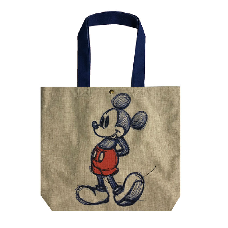ネイビーのインクで描いた「ミッキーマウス」のラフスケッチ風アートを大胆にあしらった「ヨコ型トートバッグ」
