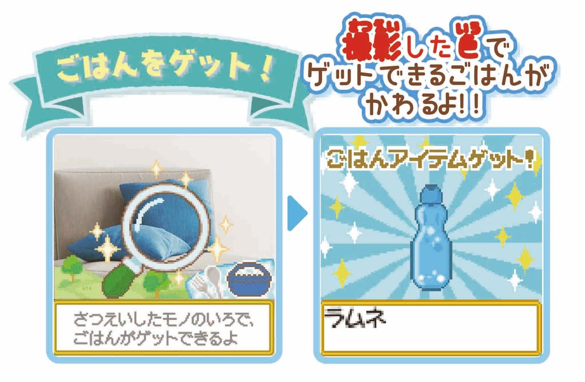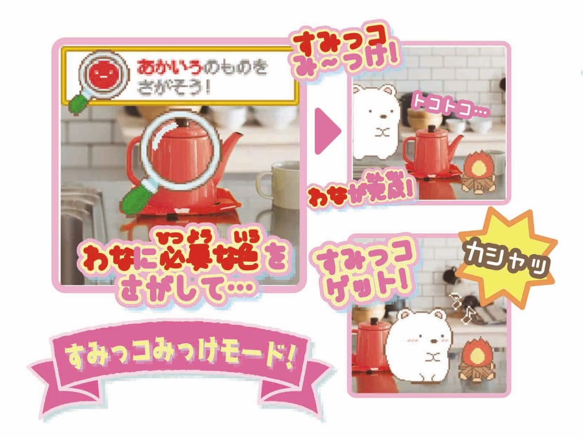 カメラで撮影した色によってつくれる“わな”やゲットできる“ごはん”、すみっコたちの“おでかけ先”が違うなど遊びの内容が変化します。