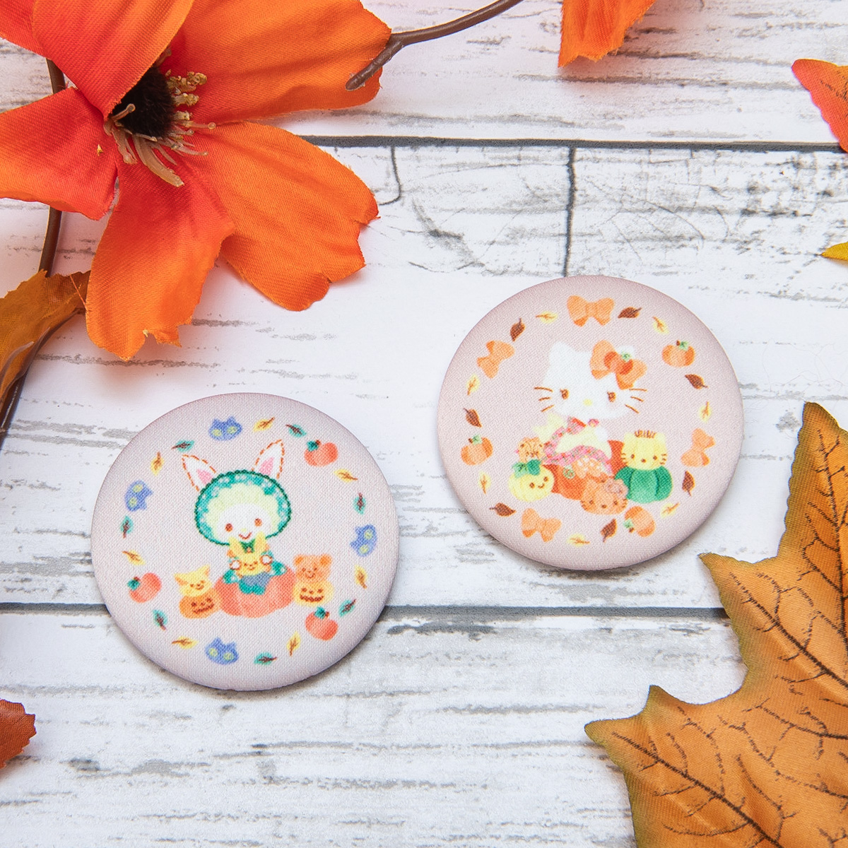 パンプキンがいっぱいのほっこりかわいい缶バッジで、大好きなキャラクターといっしょにハロウィンを楽しめます。