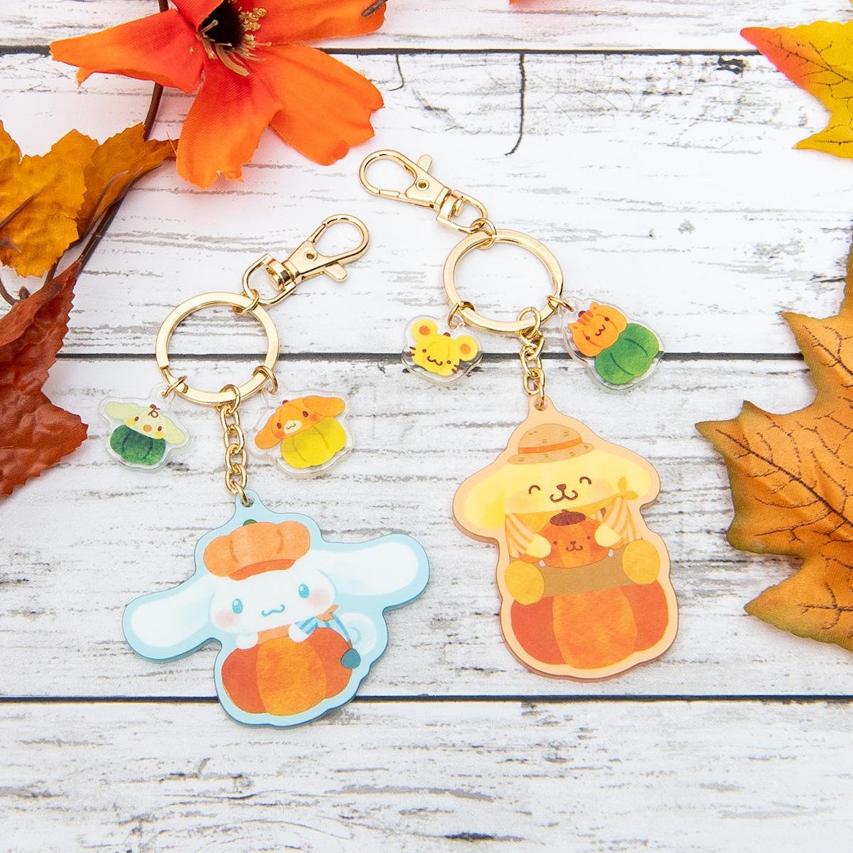カントリー風の衣装を着たキャラクターとパンプキンがかわいいアクリルキーホルダーです。