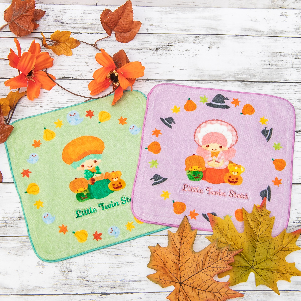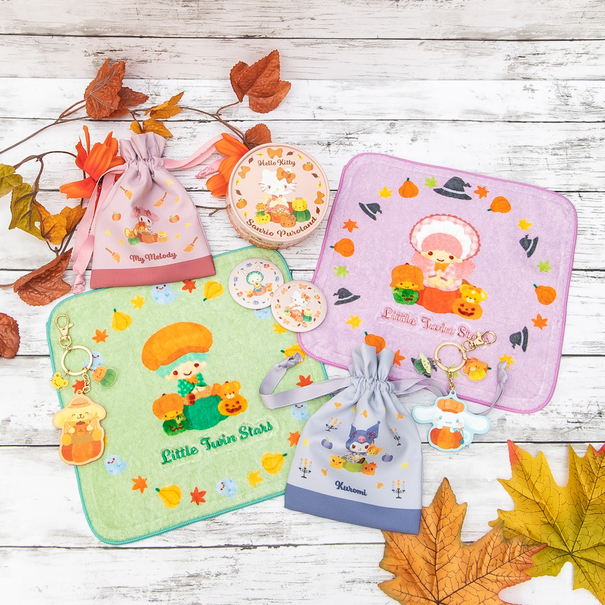 キャラクターたちがパンプキンパーティを楽しんでいるイラストが、ミニタオルや巾着など普段使いもしやすいアイテムに。