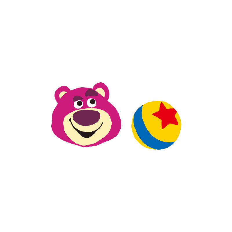 抱きしめるとイチゴのにおいがするテディベア「ロッツォ」のフェイスと「ピクサー・ボール」のワッペンが2個セットになっています。