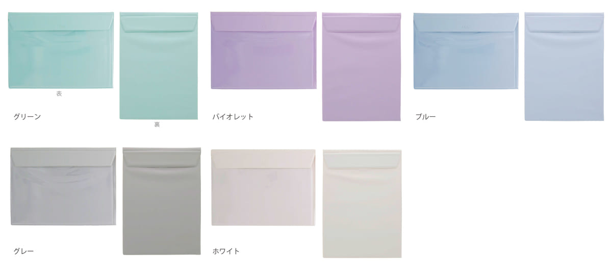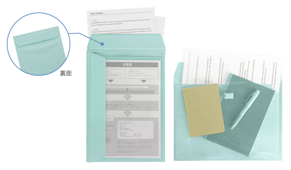 ファイルバッグの表面は、中身が見えやすい透明PVC素材で何が入っているか“ひと目で把握”でき、裏面は中身が見えないカラーPVC素材で何が入っているか“外から見えない”仕様になっています。
